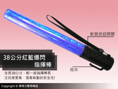 • 握 把 : ABS 塑膠材質製成 ( 附腰勾及吊帶各一 ) , 且握把底蓋附磁鐵一個 • 外管 : 採用 PC 耐衝擊材質 ( 厚度 2 mm ) 。 • 內襯 : 白色反光 PVC 材質 。 • 指揮棒前端有一顆白色 LED 燈可供照明 。 • 六段式操作說明 : ( 依序如下 ) 紅色爆閃 、藍色爆閃、紅和藍交互爆閃 ( 慢 ) 、紅和藍交互爆閃 ( 快速 ) 、 白色 LED 亮、關閉 。 • 電力供應 : 3 號 (AA) 鹼性 電池 x 4 顆 。 (交貨時未附電池) • 亮度 ( ± 5 ﹪ ):紅光1.2 流明(Lumens) 、 藍光 0.4流明(Lumens) 白光 10000 mcd。 • 使用全新鹼性 電池、藍、紅 LED 爆閃可連續 24 小時以上 。